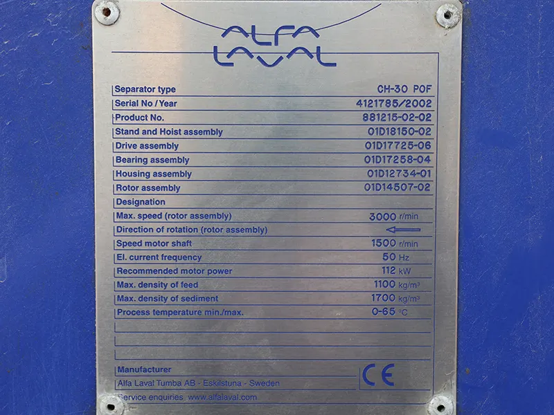 CH-30 POF is an Alfa Laval CH series disc centrifuge. It is an efficient separation device. Its core lies in achieving precise separation of liquid-solid, liquid-liquid or liquid-liquid-solid through the high-speed rotating disc stack structure.