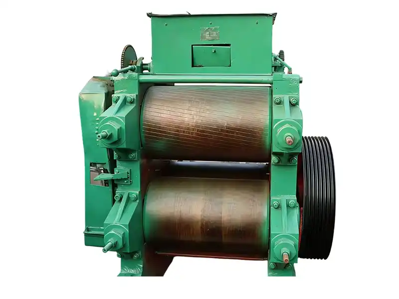 • 双对辊的工作原理:将油料送入两对相反方向旋转的辊之间的空间。通过滚筒的挤压和剪切作用,将颗粒状油料卷成均匀的片状片(片状片的厚度通常可调节至0.3-0.5mm);双对辊设计可实现“片材二次轧制”,使片材更薄、更均匀,满足高含油量油料的加工要求。